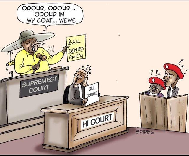 Museveni’s kangaroo court yesterday rejected bail pleas by outspoken opposition MPs Muhammad Ssegirinya and Allan Ssewanyana who face several concocted charges, including “murder”, “attempted murder”, “aiding and abetting terrorism.”
