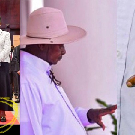 Senile arm-rotting dictator Museveni received President Filipe Nyusi today at his state house in Nakasero. Alongside him was epileptic Janet Mwesigwa Makumbi Kataha alias ‘Elephantiasis’.